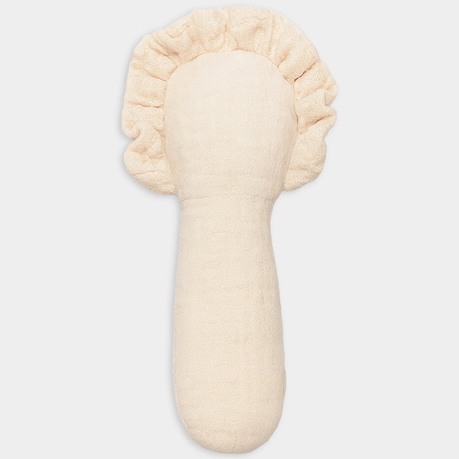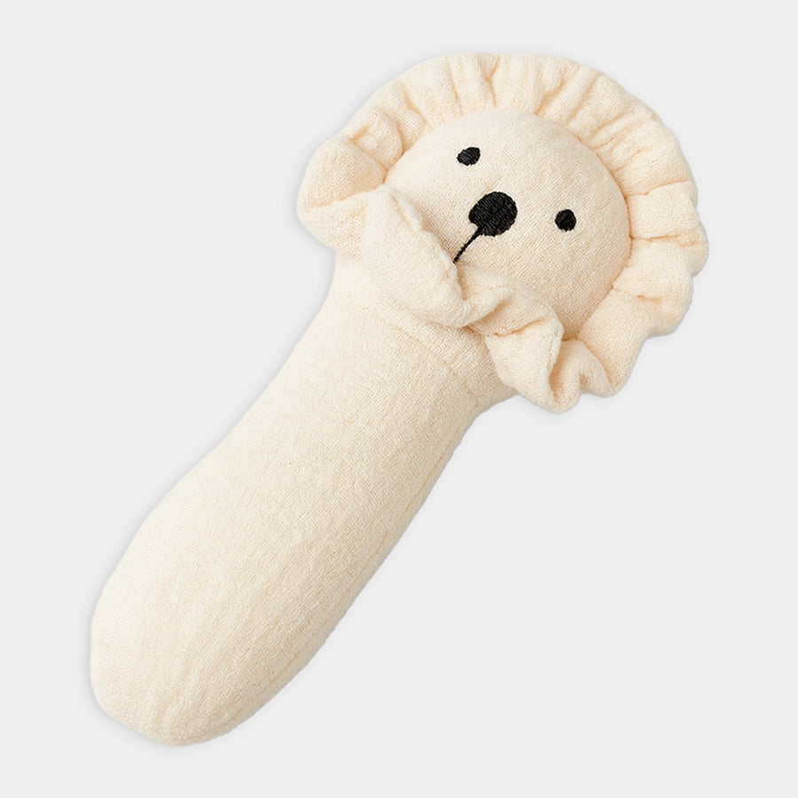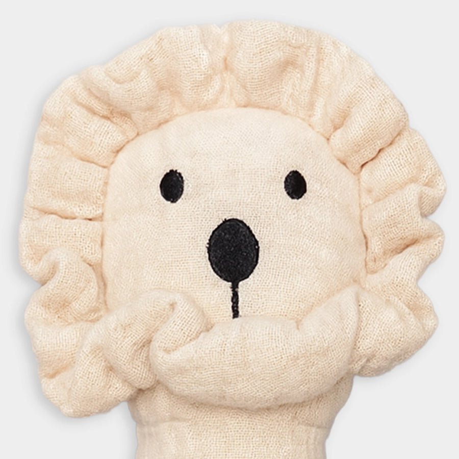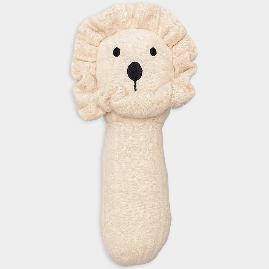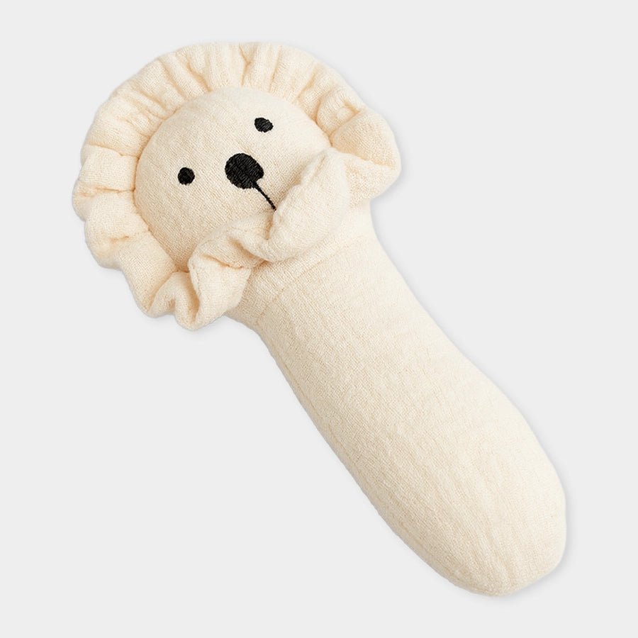 Squeaky rattle toy in soft 100% muslin cotton and 100% polyester filling. Features a lion-themed design with embroidered detailing, gentle squeaky sound when pressed to keep your little one curious, entertained, and help develop their motor and sensory skills. Perfect for playtime or stroller rides. Best suitable for kids 0-6M.