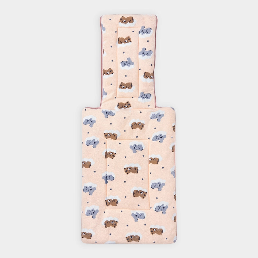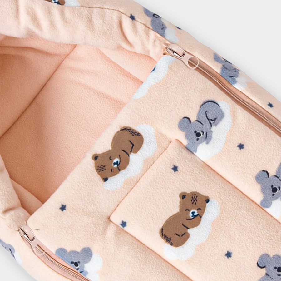 Baby carry nest in soft 100% polyester and filling inside for extra cushioning. Lightweight and portable, it features all-over prints on the outside, a convenient side, and a hood zip for easy conversion into a mattress or carry nest. Best for kids 0-6M. Size: 70x28 cm