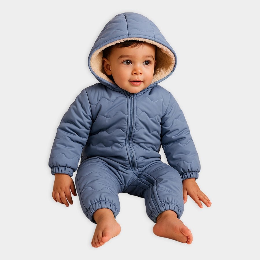 Jumpsuit for boys woven in soft 100% polyester for the winter season. Features a quilted pattern design, sherpa lining for added warmth, attached hood, full sleeves with soft, elasticated cuffs for a snug and secure fit, elasticated bottom hem for ease of movement, zip open down the front and leg for easy dressing and diaper changes. Available in different sizes for kids 0-18M.