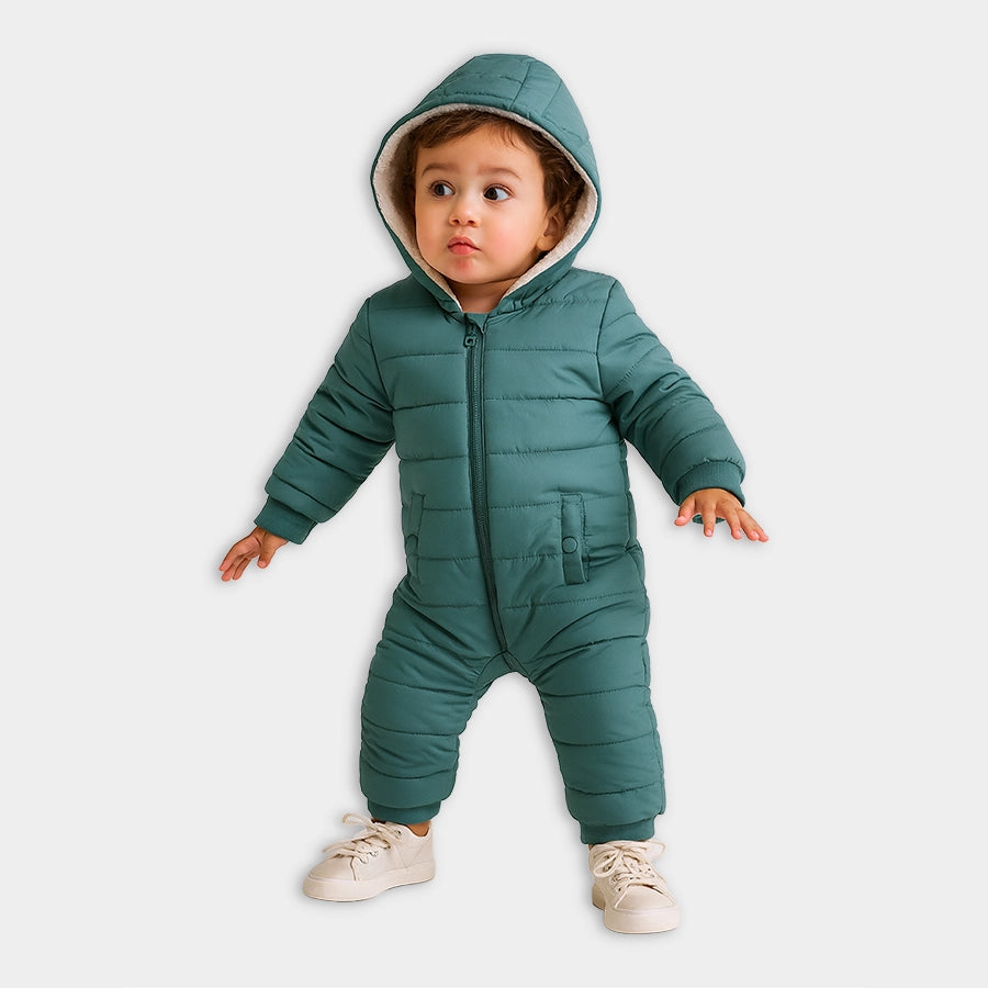 Unisex puffer sleepsuit woven in soft 100% polyester for the winter season. Features full sleeves, an attached hood, front-open zip, ribbed cuffs and leg opening, quilted designs, side pockets with snap button opening, and a fleece lining inside. Available in different sizes for kids 3M-18M.