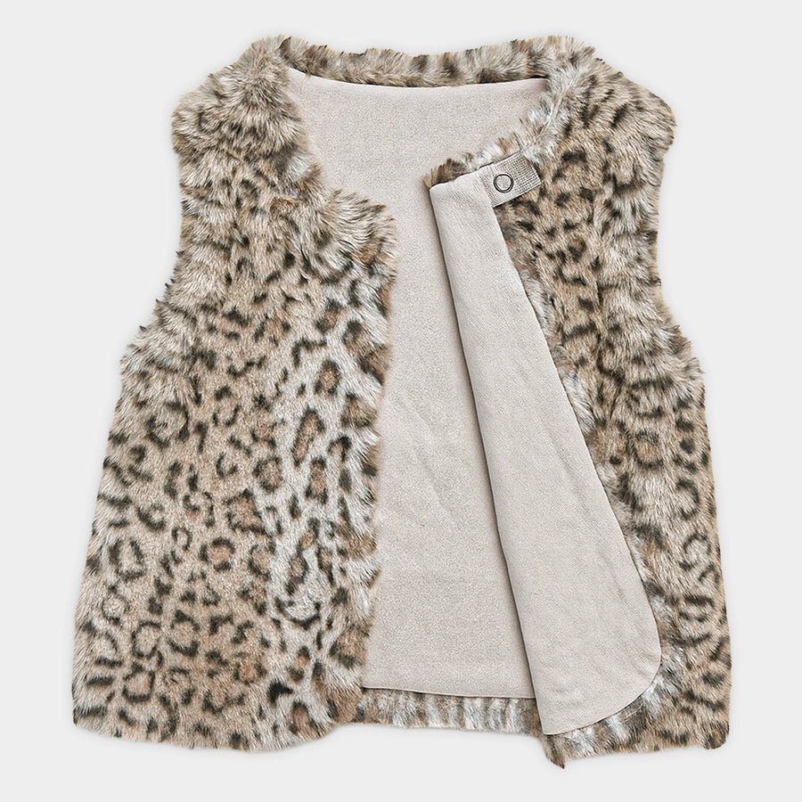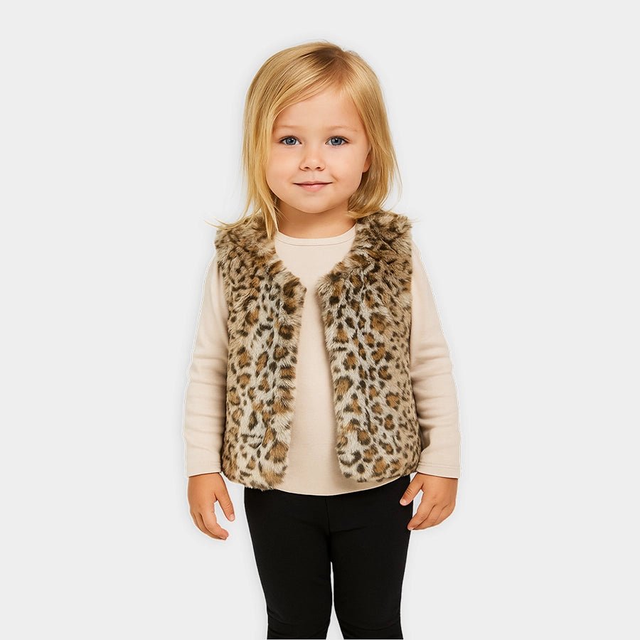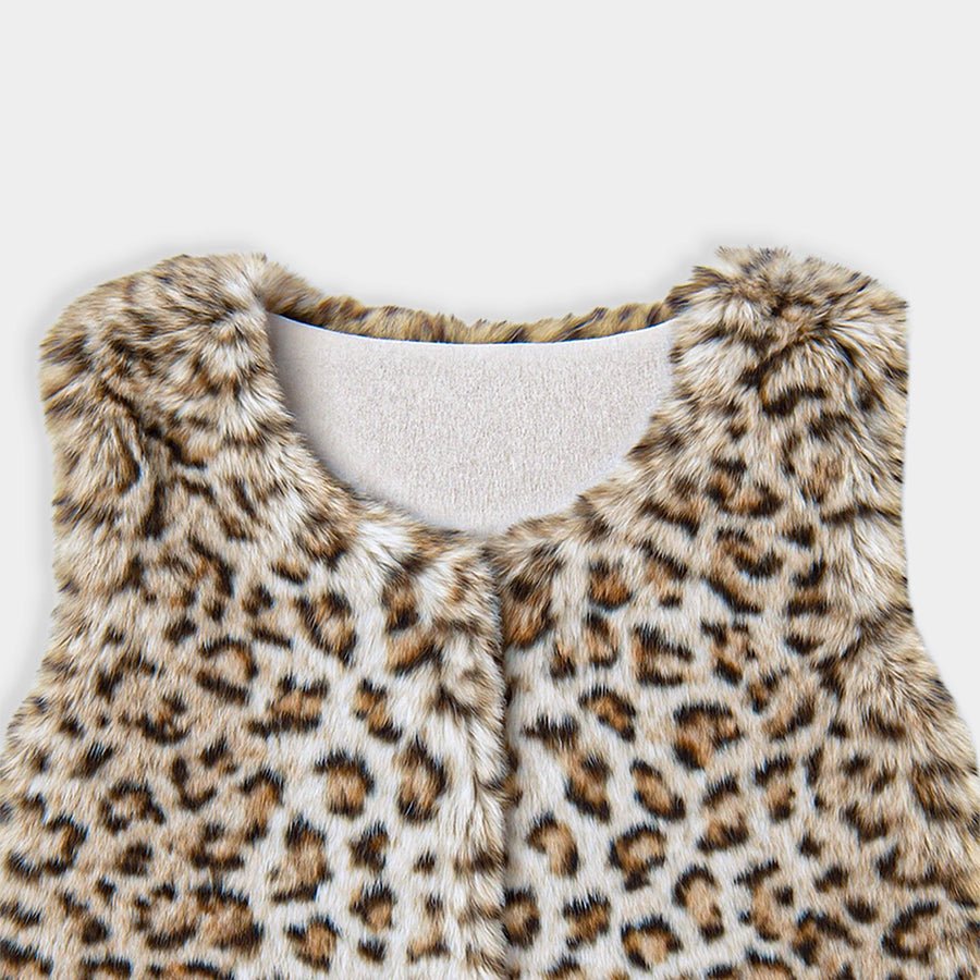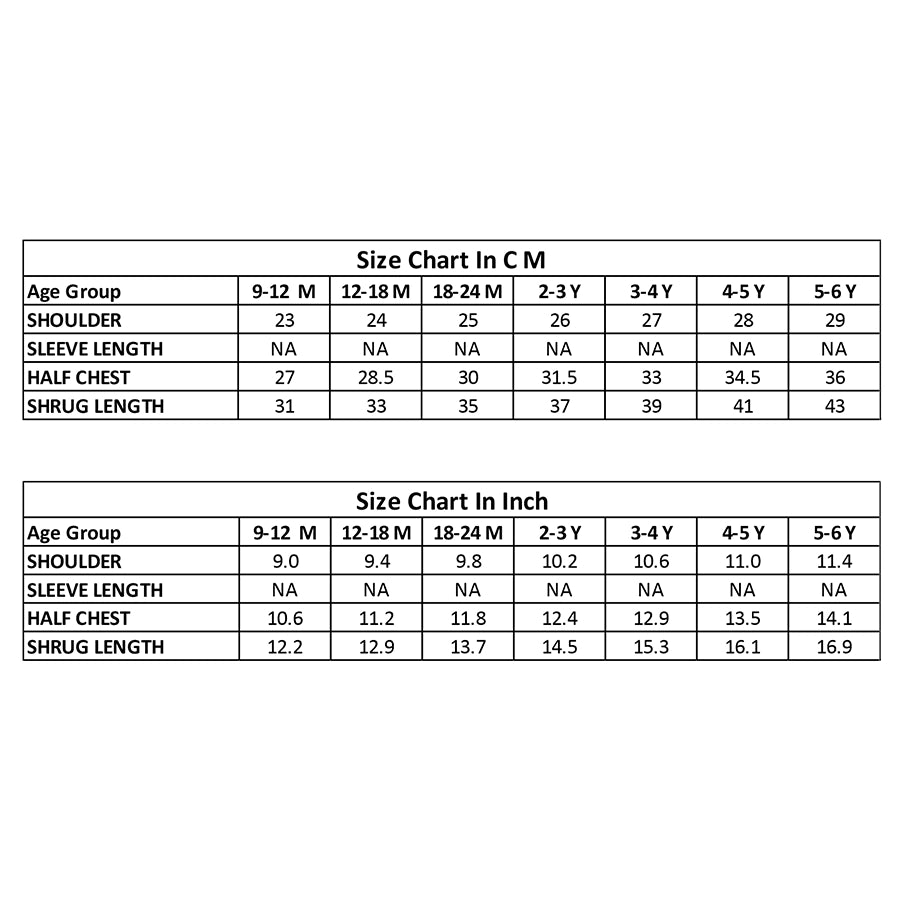 Sleeveless shrug for girls in soft 100% polyester outer and inner lining in soft 80% polyester and 20% cotton blend for the winter season. Features a one-button closure at the front and printed designs. Available in different sizes for kids 9M-6Y.