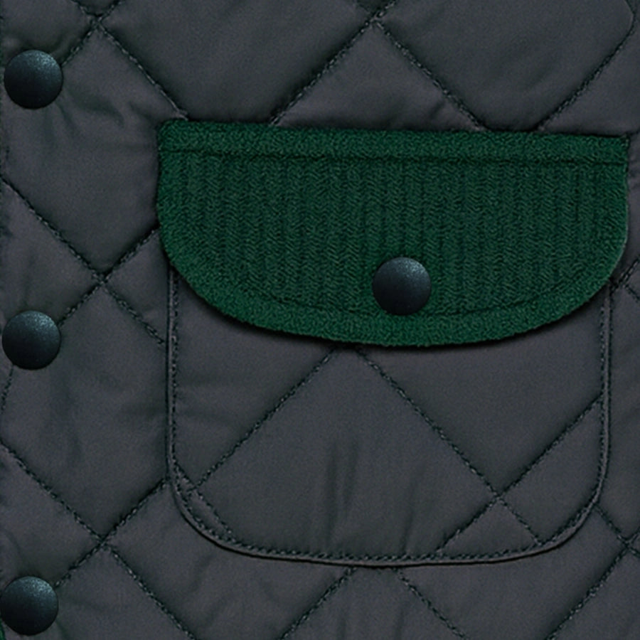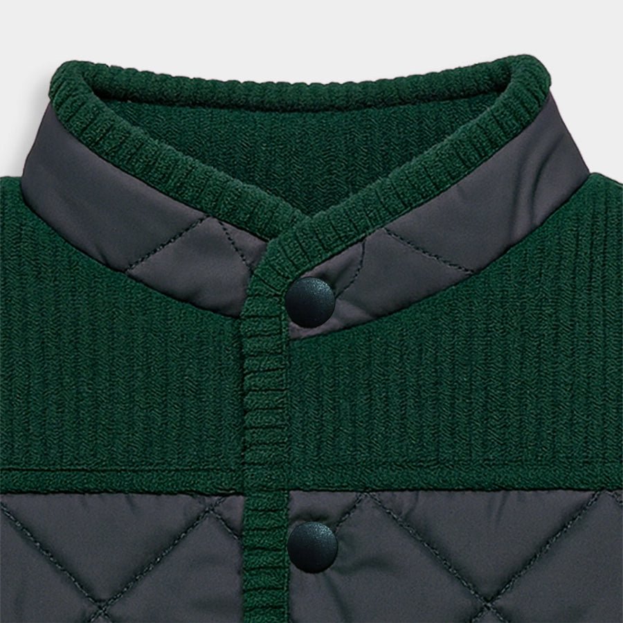 Sleeveless jacket for boys in soft 100% polyester and filling for the winter season. Features a high neckline, snap button opening down the front, quilted design, buttoned front pockets with corduroy pocket flaps, and corduroy finishing on the upper yoke and piping. Available in different sizes for kids 6M-6Y.