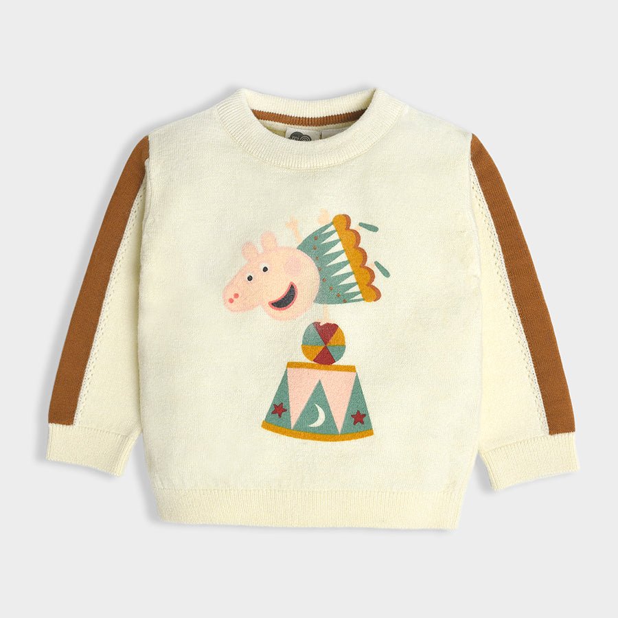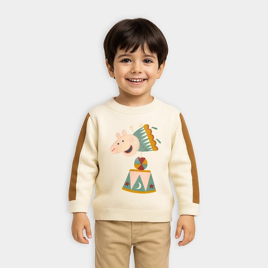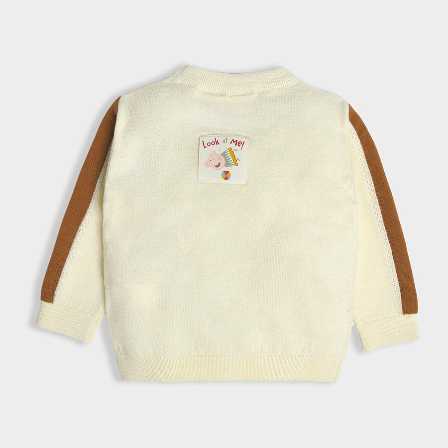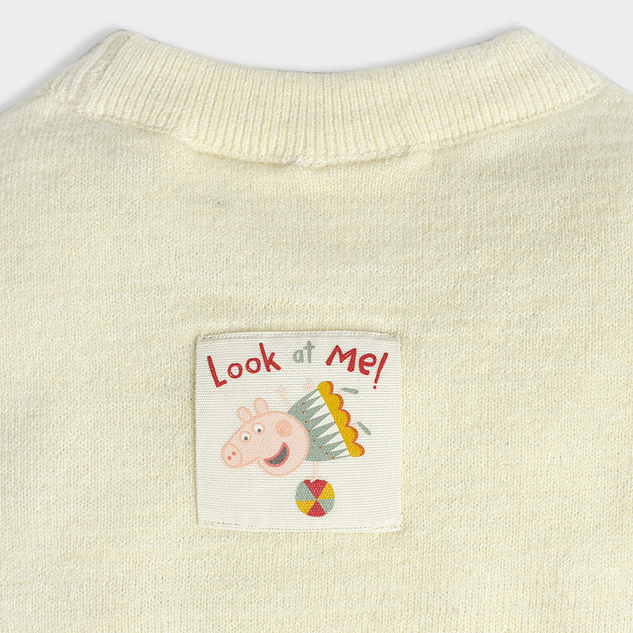 Unisex sweater for kids in soft knit 52% acrylic, 30% nylon, and 18% PBT blend for the winter season. Features full sleeves with knitted contrast-coloured striper pattern at the outseam, knitted Peppa-Pig theme design at the front centre, small patchwork design at the back, and ribbing at the neckline, cuffs, and bottom hem. Available in different sizes for kids 0-6Y.