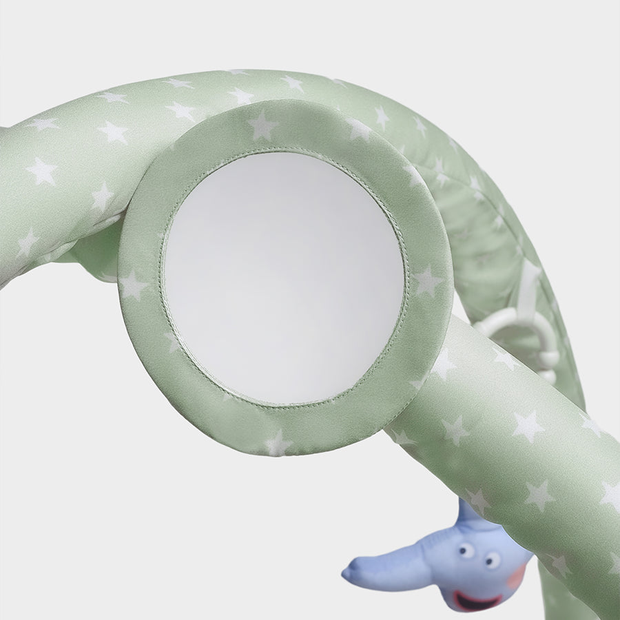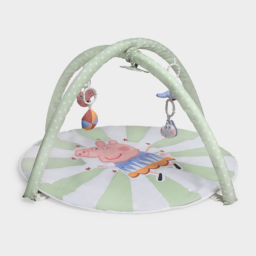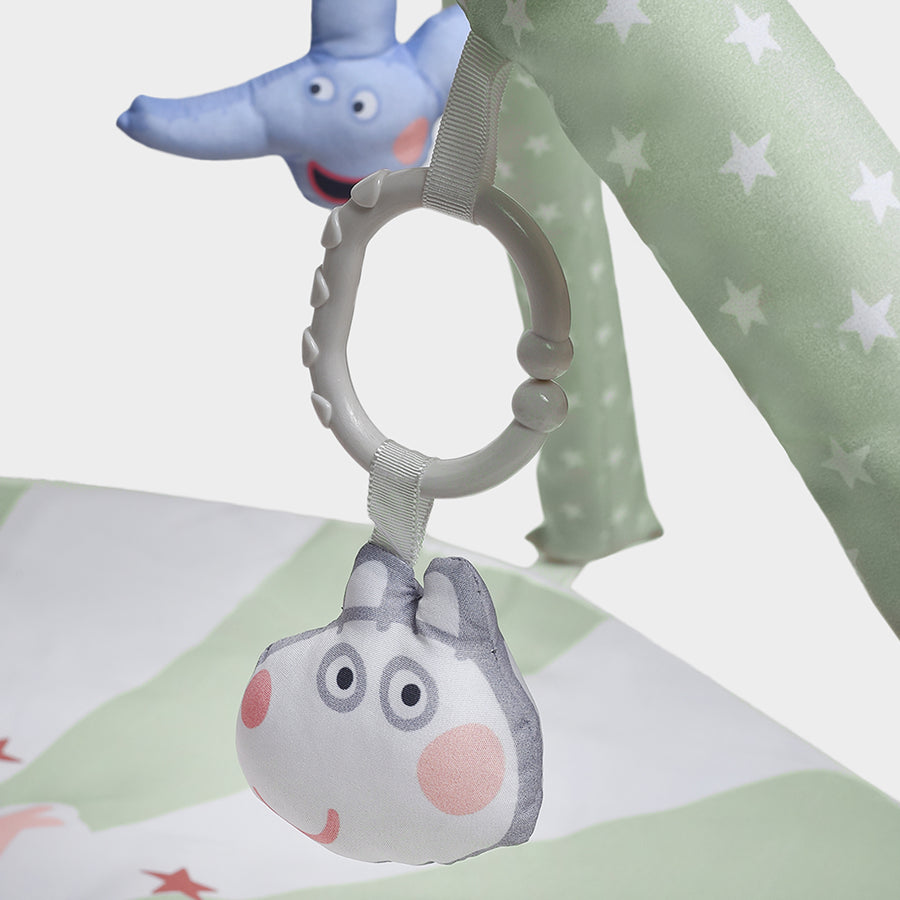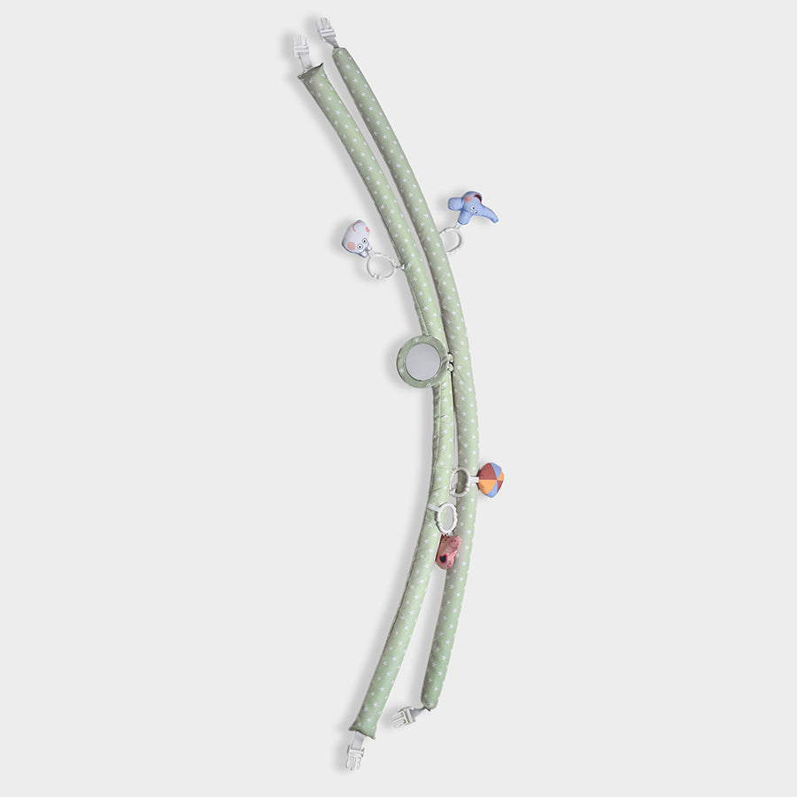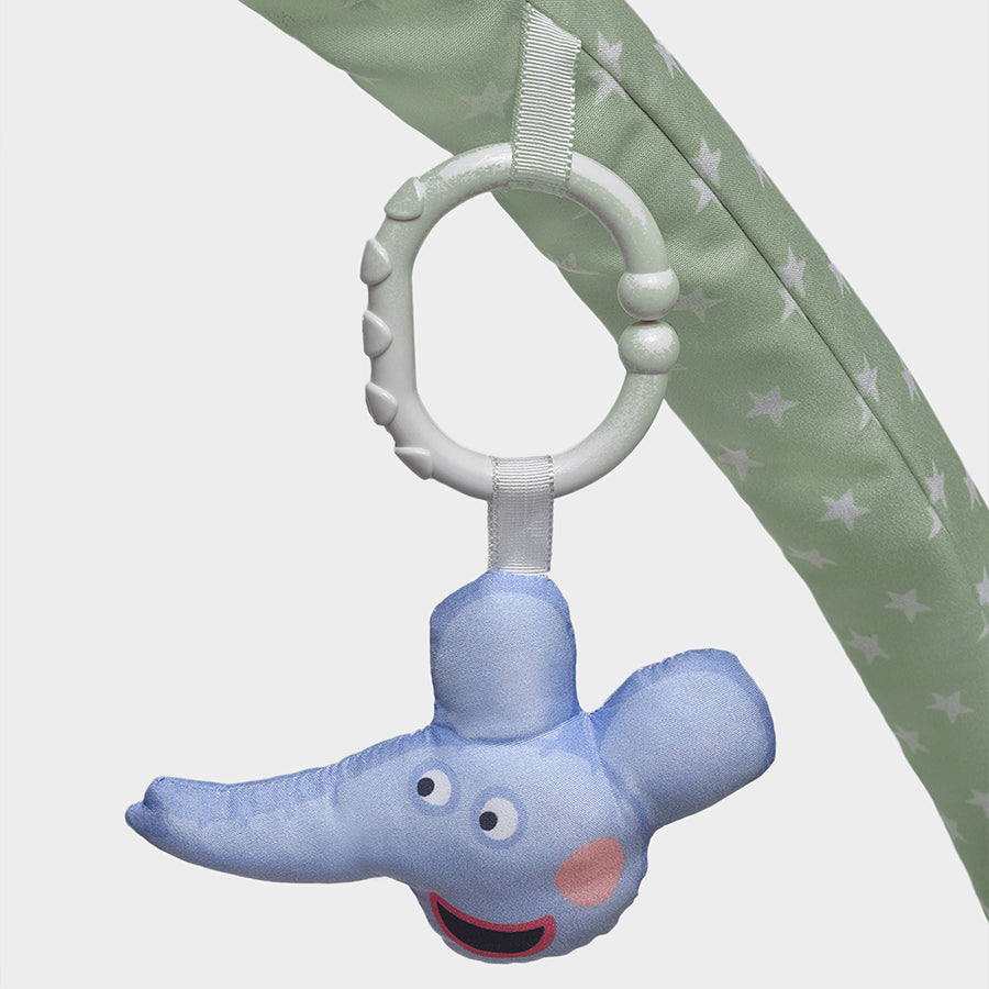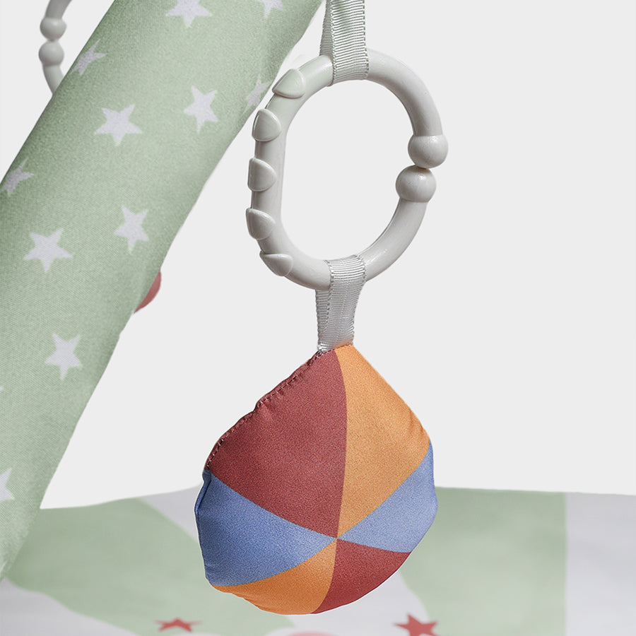 Play gym for babies in soft 100% polyester and filling. Features a cushioned, printed surface for safe tummy time and playtime, detachable corduroy tubes with buckles, and hanging, removable toys with crinkle and bell sounds for visual, tactile, and auditory exploration. Size: 90x90 cm