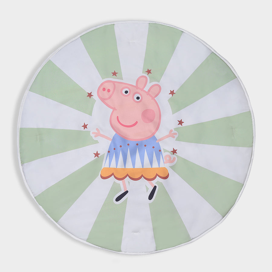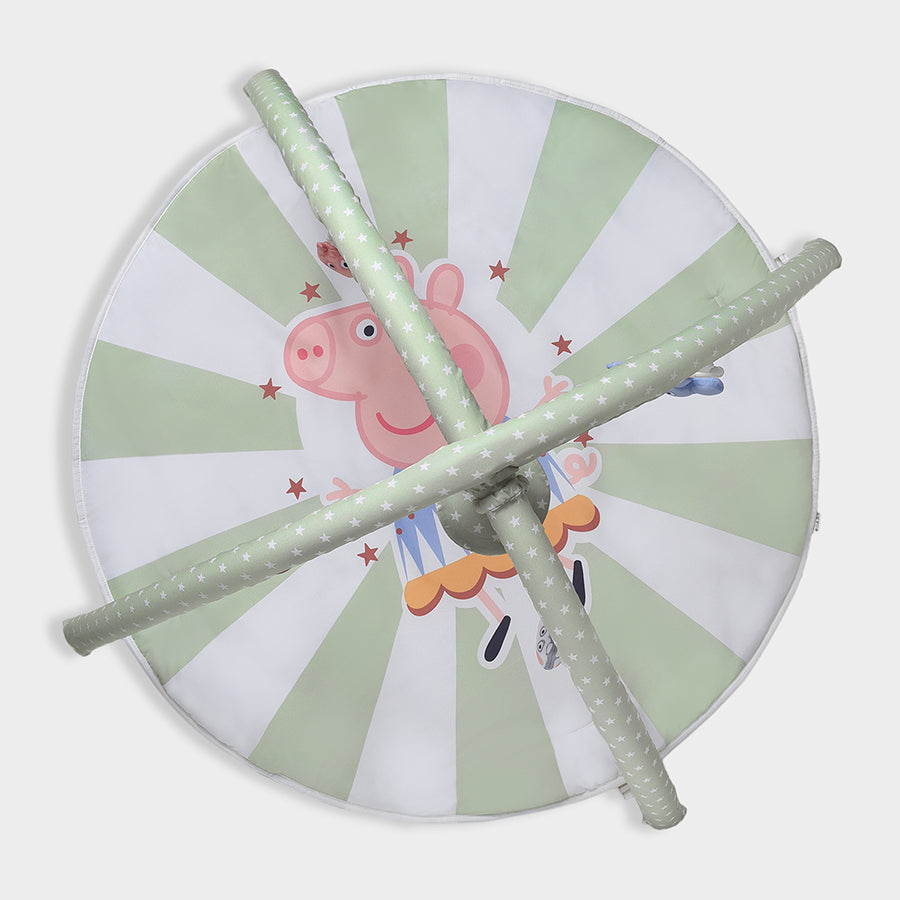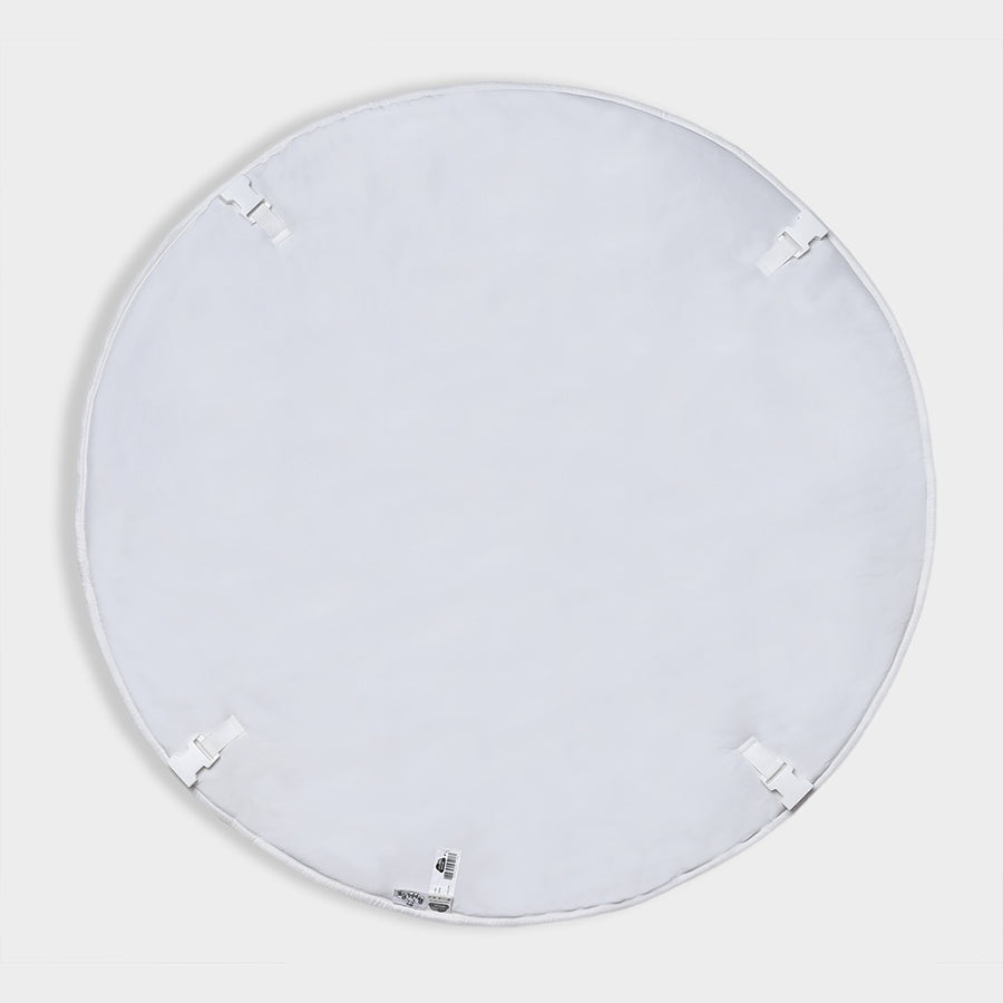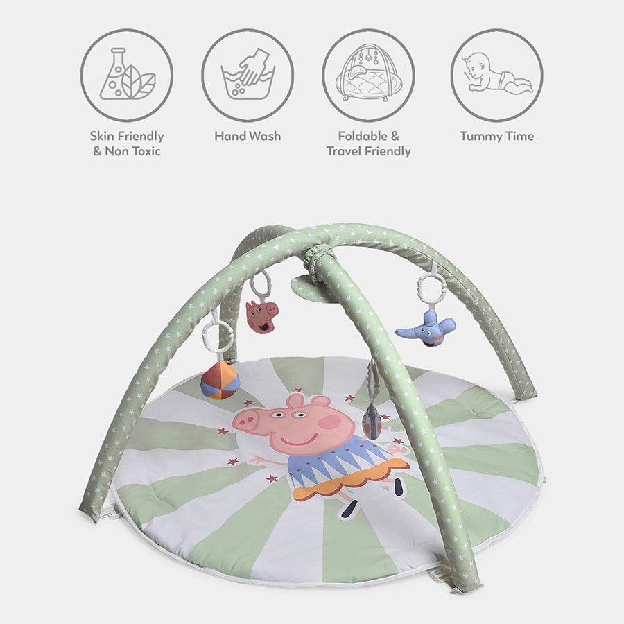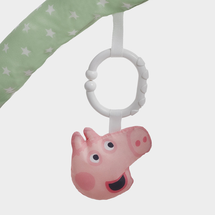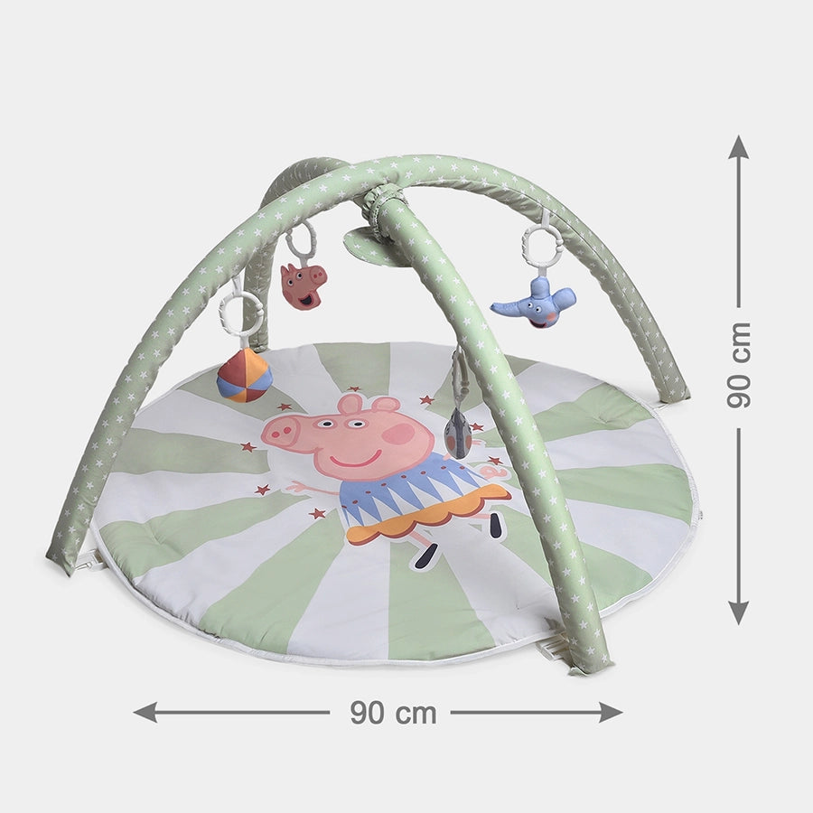 Play gym for babies in soft 100% polyester and filling. Features a cushioned, printed surface for safe tummy time and playtime, detachable corduroy tubes with buckles, and hanging, removable toys with crinkle and bell sounds for visual, tactile, and auditory exploration. Size: 90x90 cm