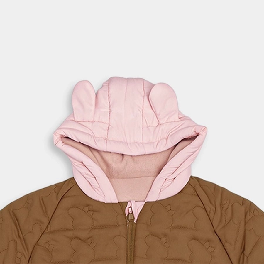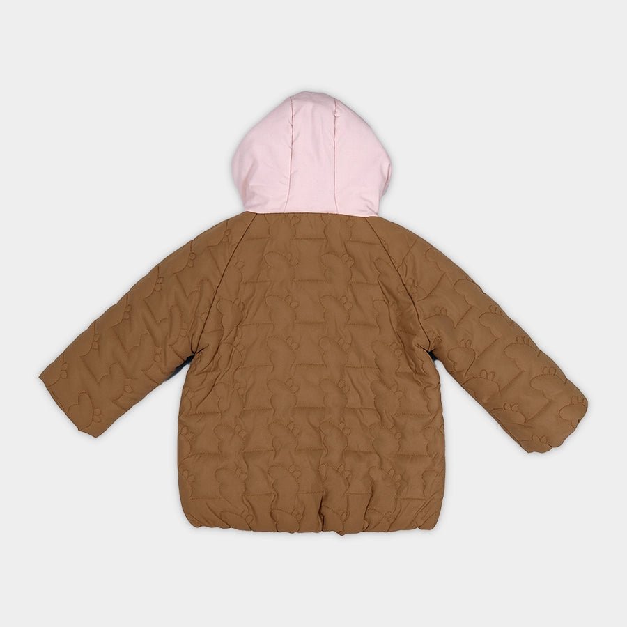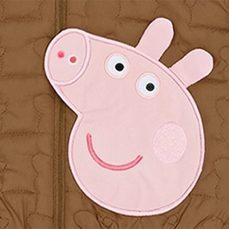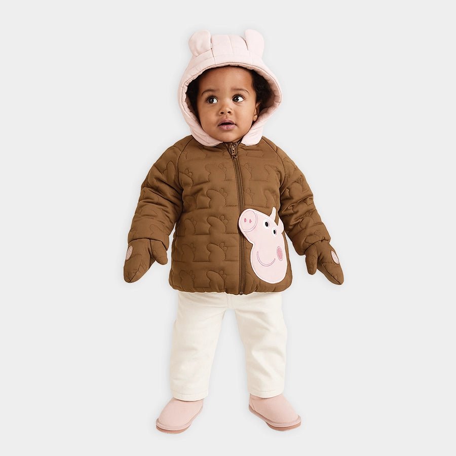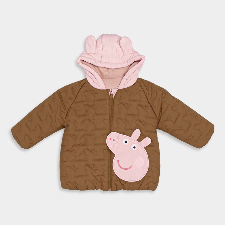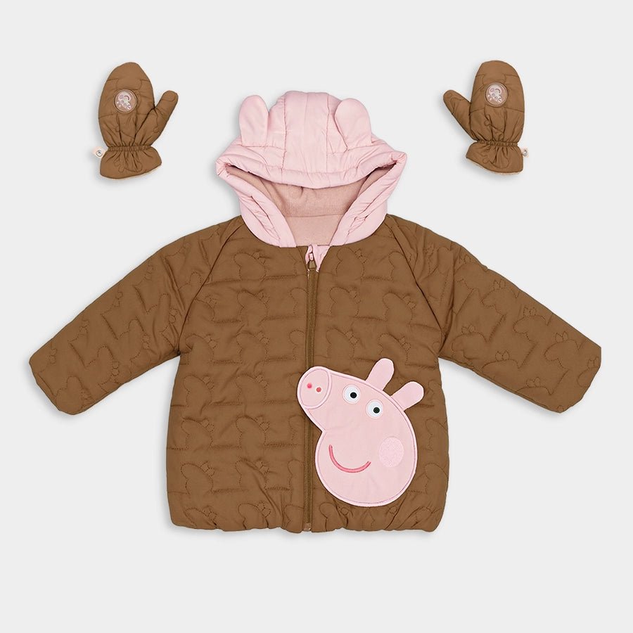 Unisex hooded jacket and mittens set woven in soft 100% polyester for the winter season. Features full sleeves, attached hood with 2-D Peppa Pig theme ears, fleece lining inside, zip opening down the front, zip guard near the neckline, attached 2D Peppa Pig theme patchwork, elasticated cuffs and bottom hem, and detachable matching mittens with elastic string and snap button. Available in different sizes for kids 6M-6Y.