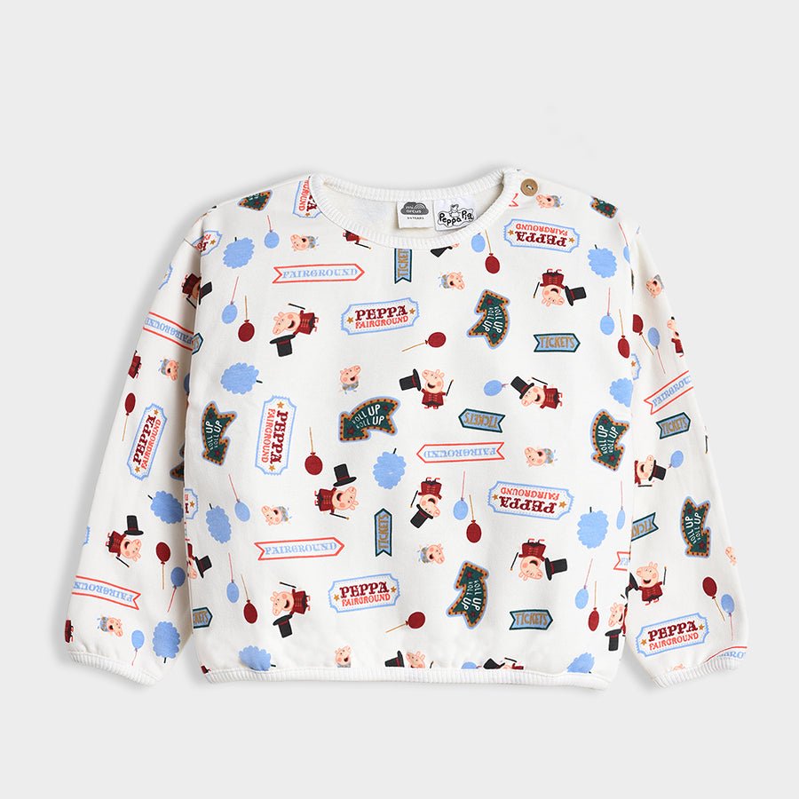 Unisex sweatshirt in soft knit 85% cotton, and 15% polyester blend for the winter season. Features full sleeves, all-over Peppa Pig theme prints, stretchable rib-knit bottom hem and cuffs, and wood-look shoulder button opening. Available in different sizes for kids 2-6Y.