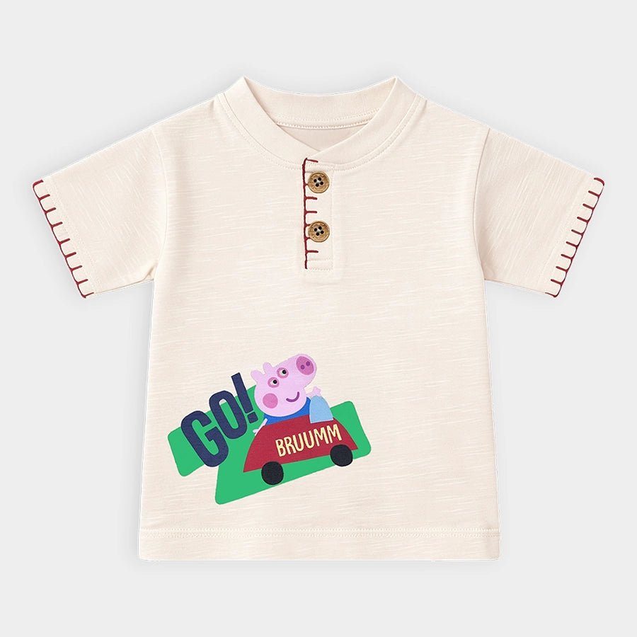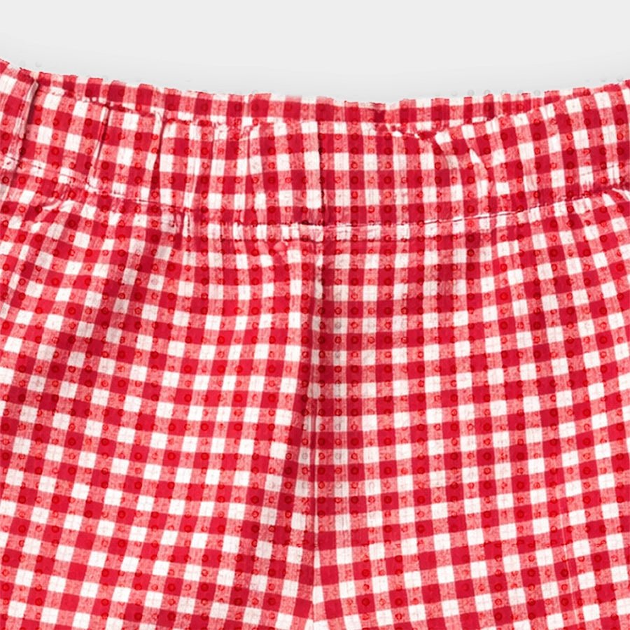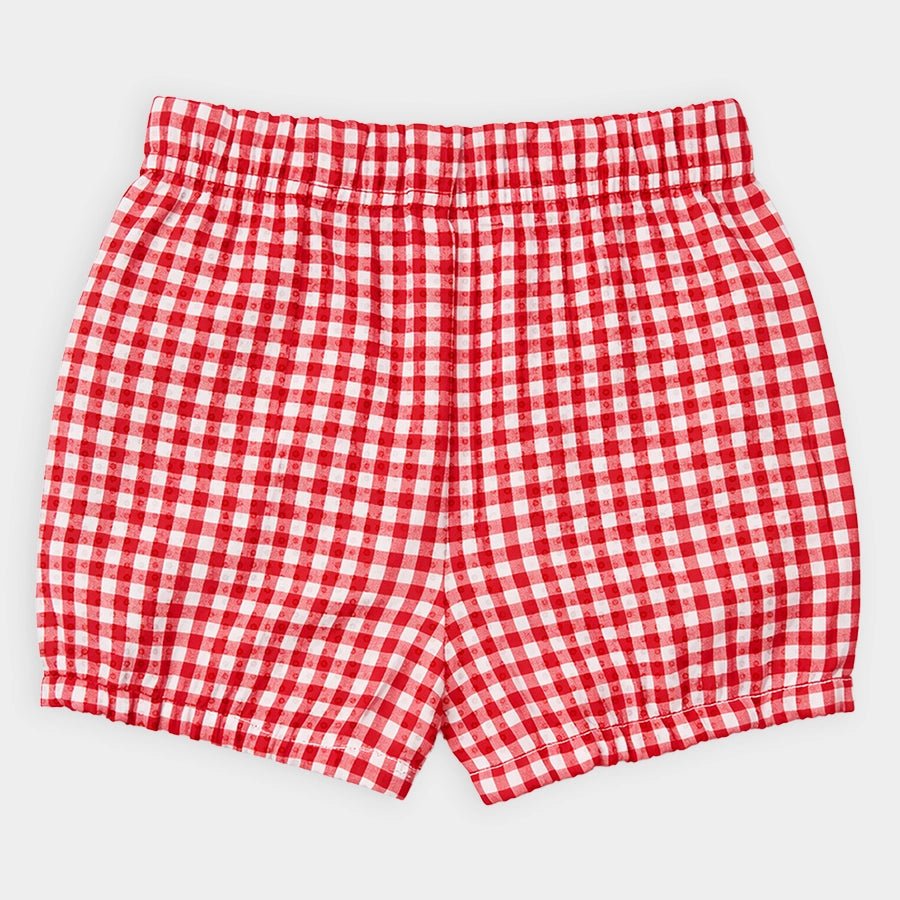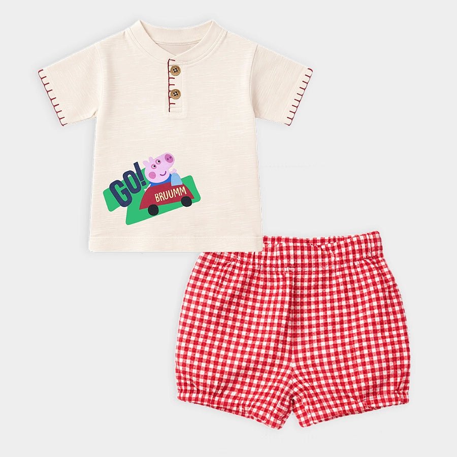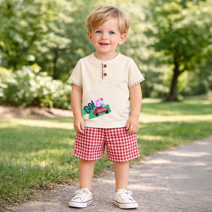 T-shirt and shorts set for boys in soft knit 100% cotton for the summer season. Includes a t-shirt with printed designs at the front and back, wood-look 2-button placket and half sleeves with stitch finishing. Balloon shape shorts in seersucker fabric with a concealed elasticised waistband and at the leg opening, and gingham check. Available in different sizes for kids 0-24M.