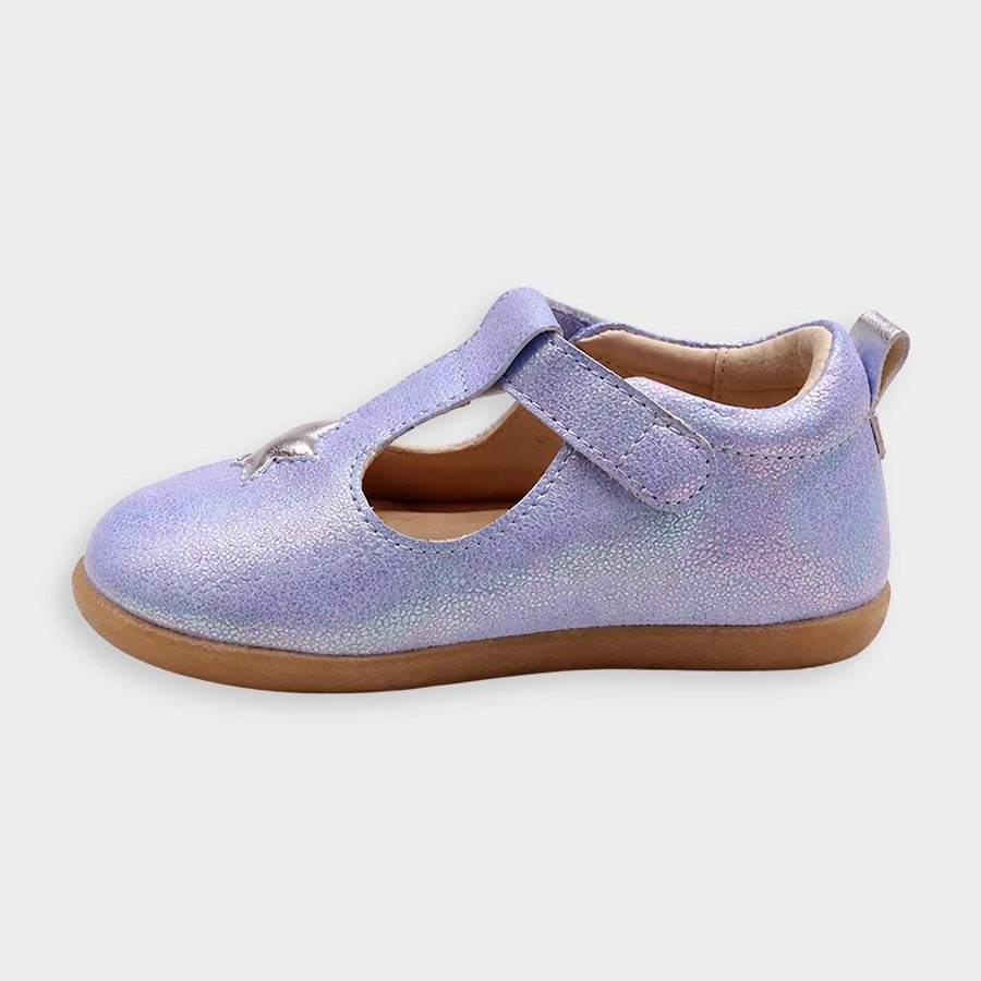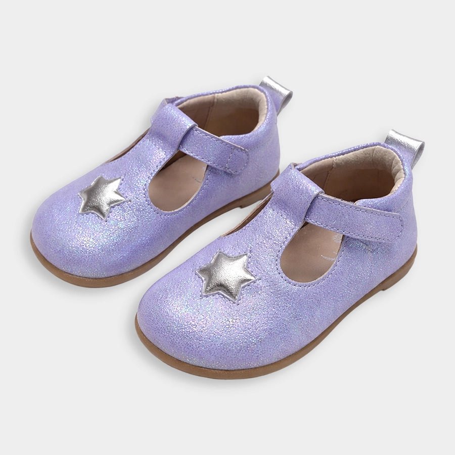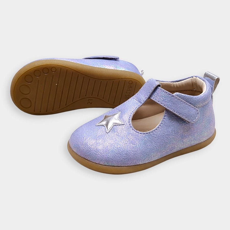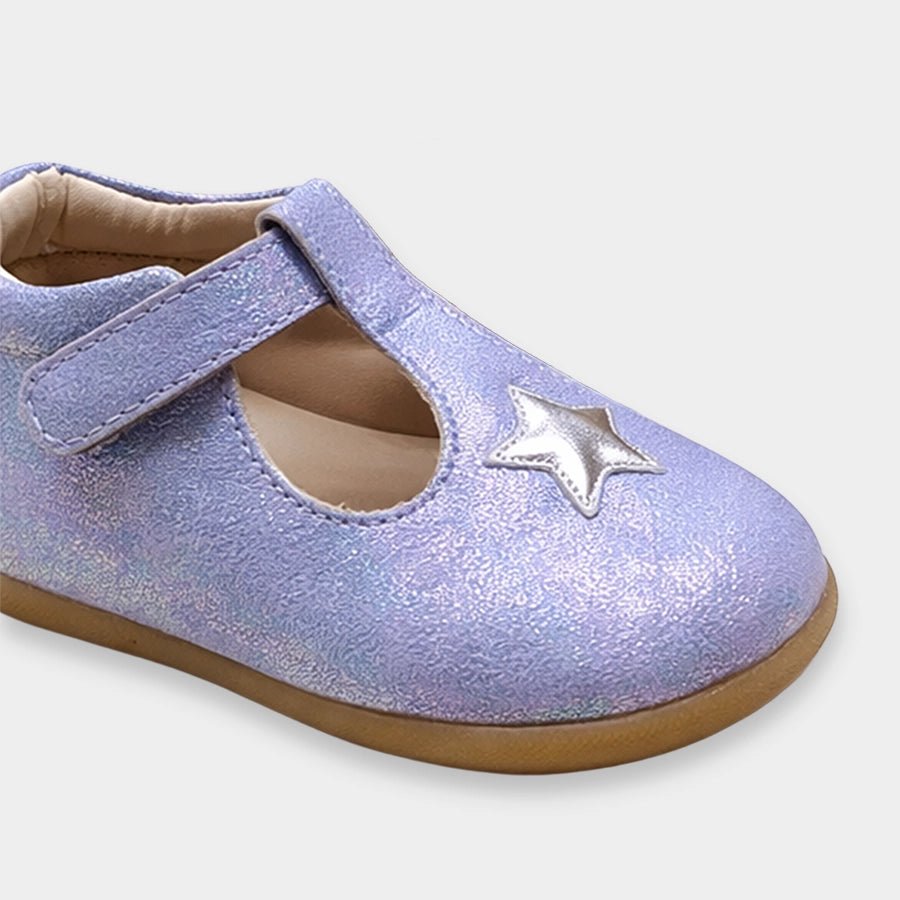 Sandals for girls with upper in PU material and patterned TPR outsole. Features velcro-fasten hook and loop tab over the foot and decorative star-theme detailing on top. Available in different sizes for kids 3M-6Y.