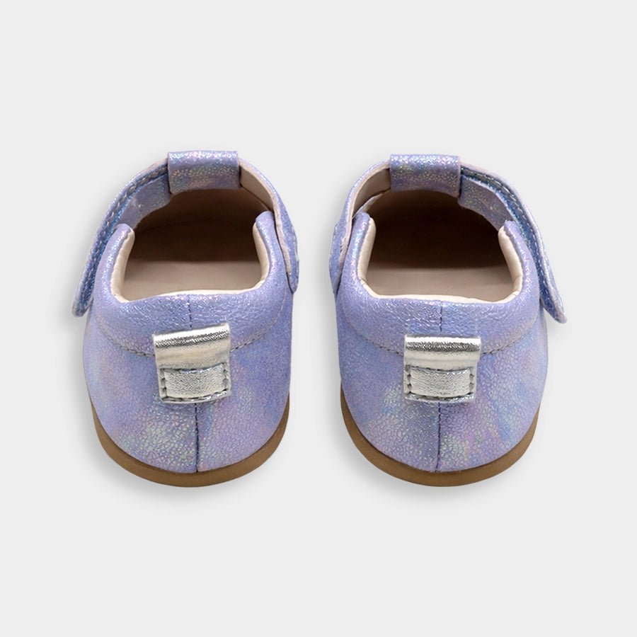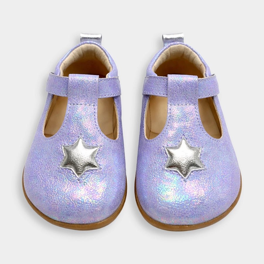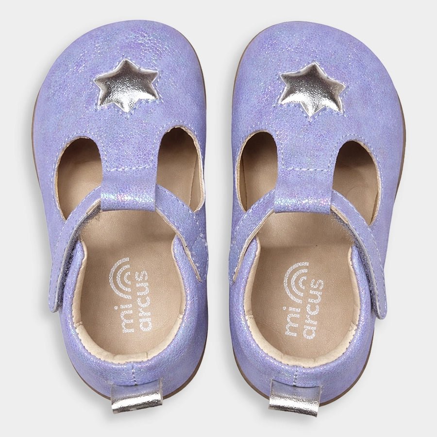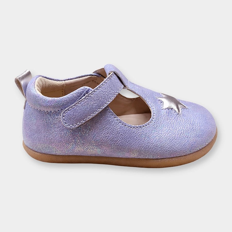 Sandals for girls with upper in PU material and patterned TPR outsole. Features velcro-fasten hook and loop tab over the foot and decorative star-theme detailing on top. Available in different sizes for kids 3M-6Y.