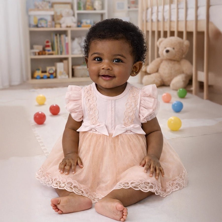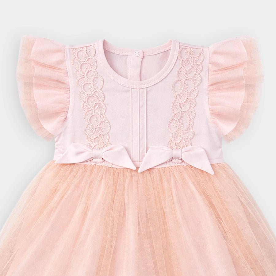Frock for girls in soft 100% cotton for the summer season. Features embroidered designs, attached mesh and fabric short sleeves, bow detailing, 100% polyester mesh detailing with lace work, and snap button placket at the back. Available in different sizes for kids 0-24M.