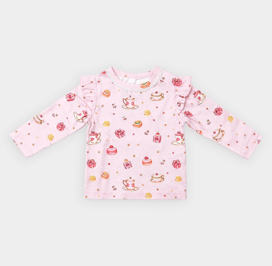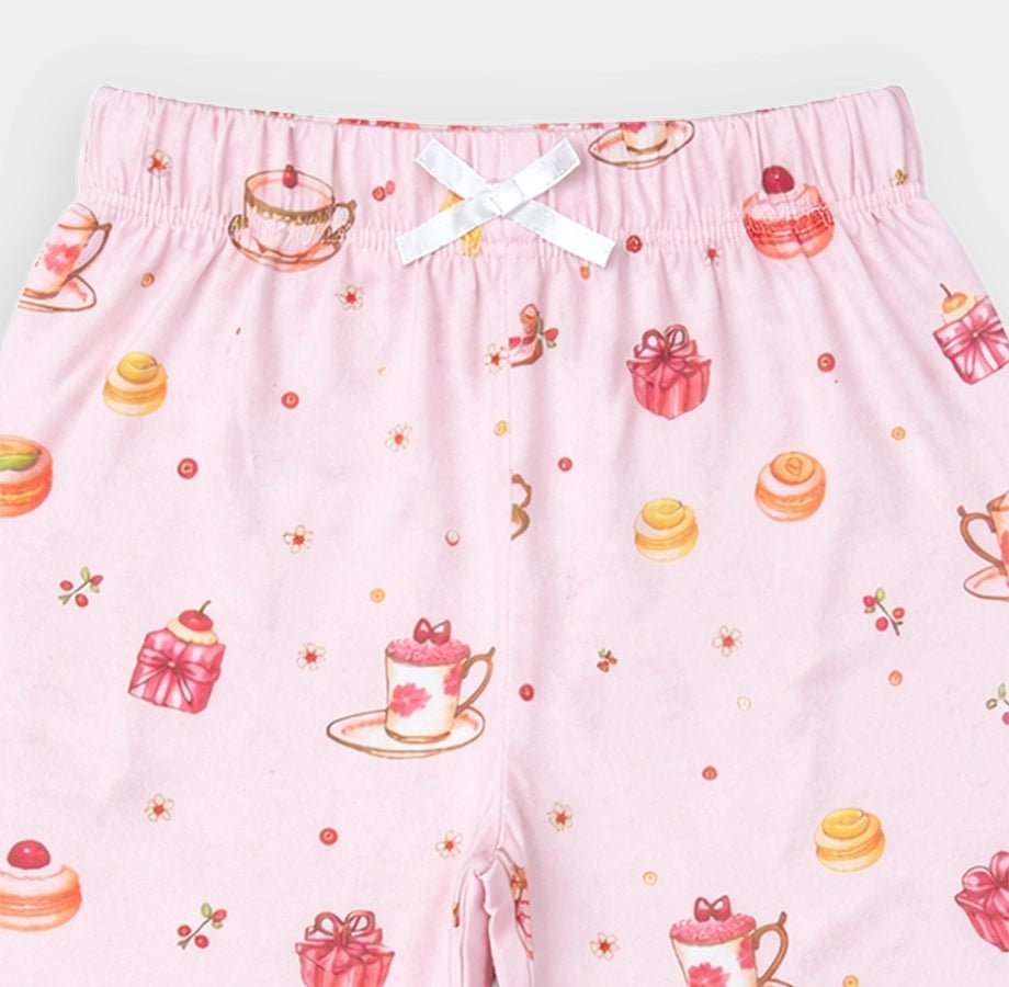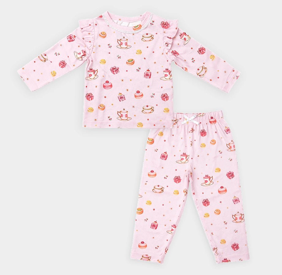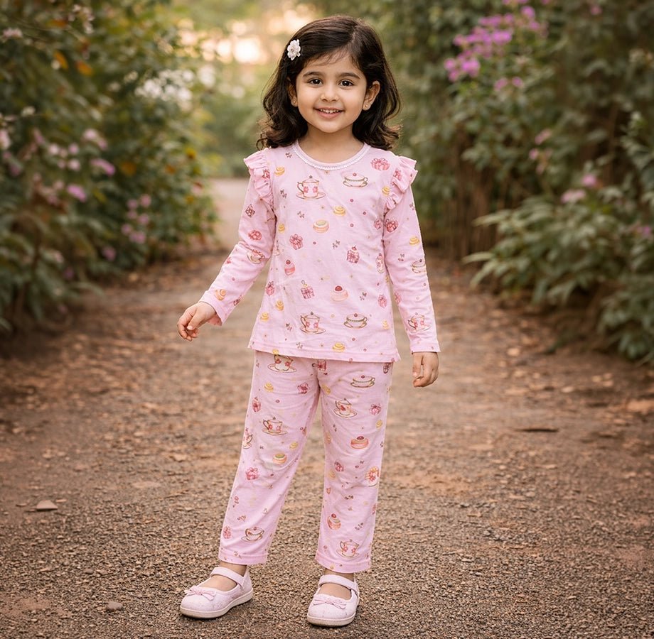 Night suit for girls in soft cotton for the summer season. Features a full-sleeve top with printed designs, frilled detailing on the shoulder, lace detailing on the neckline with snap button opening. Matching pyjamas with a concealed elasticised waistband. Available in different sizes for kids 0-6Y.