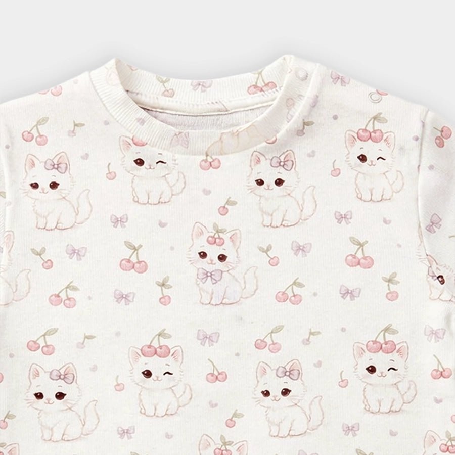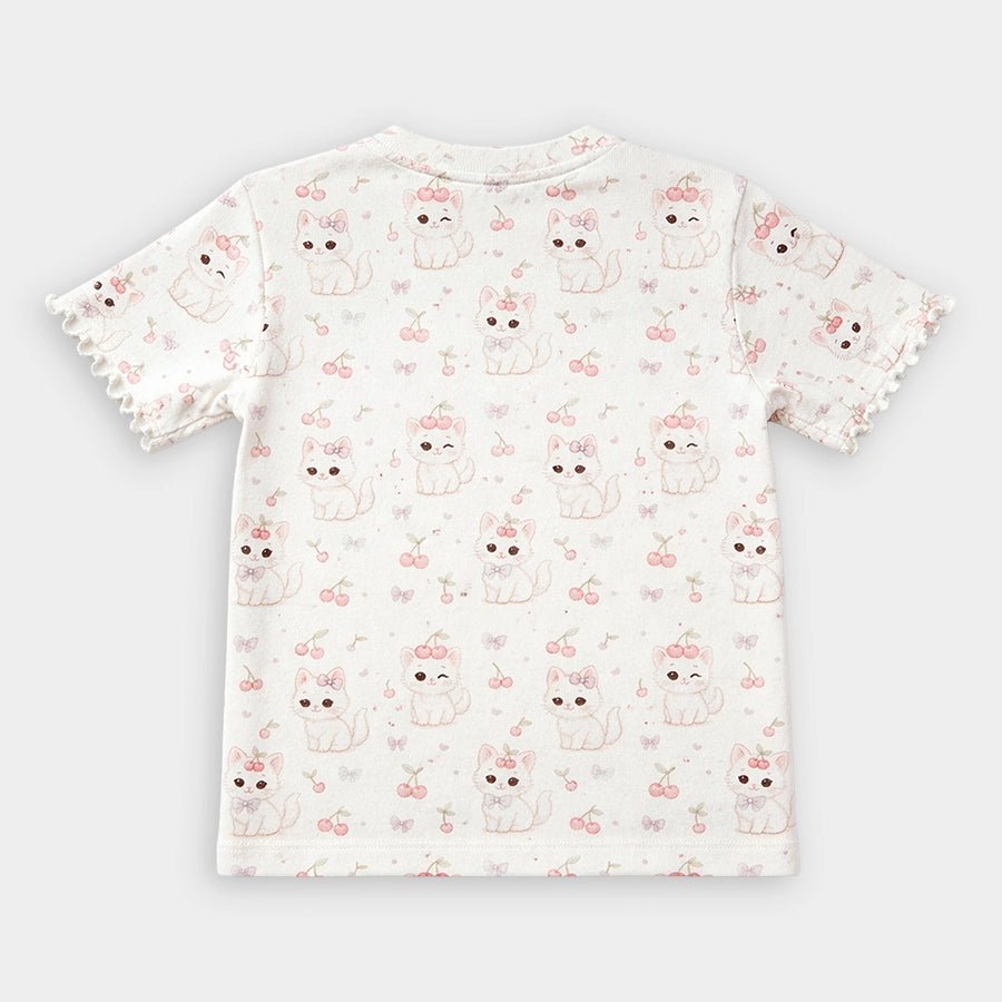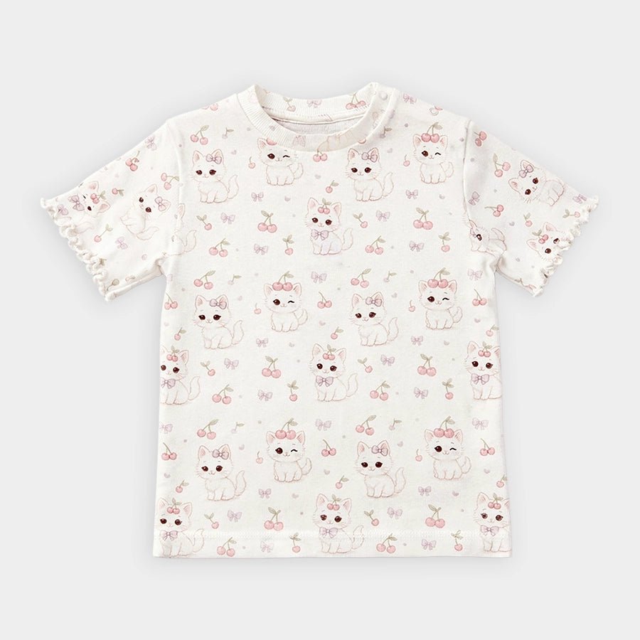 T-shirt for girls in soft knit 95% cotton and 5% elastane blend for the summer season. Features printed designs, shoulder snap button, and ribbed and overlocking detailing. Available in different sizes for kids 0-6Y.