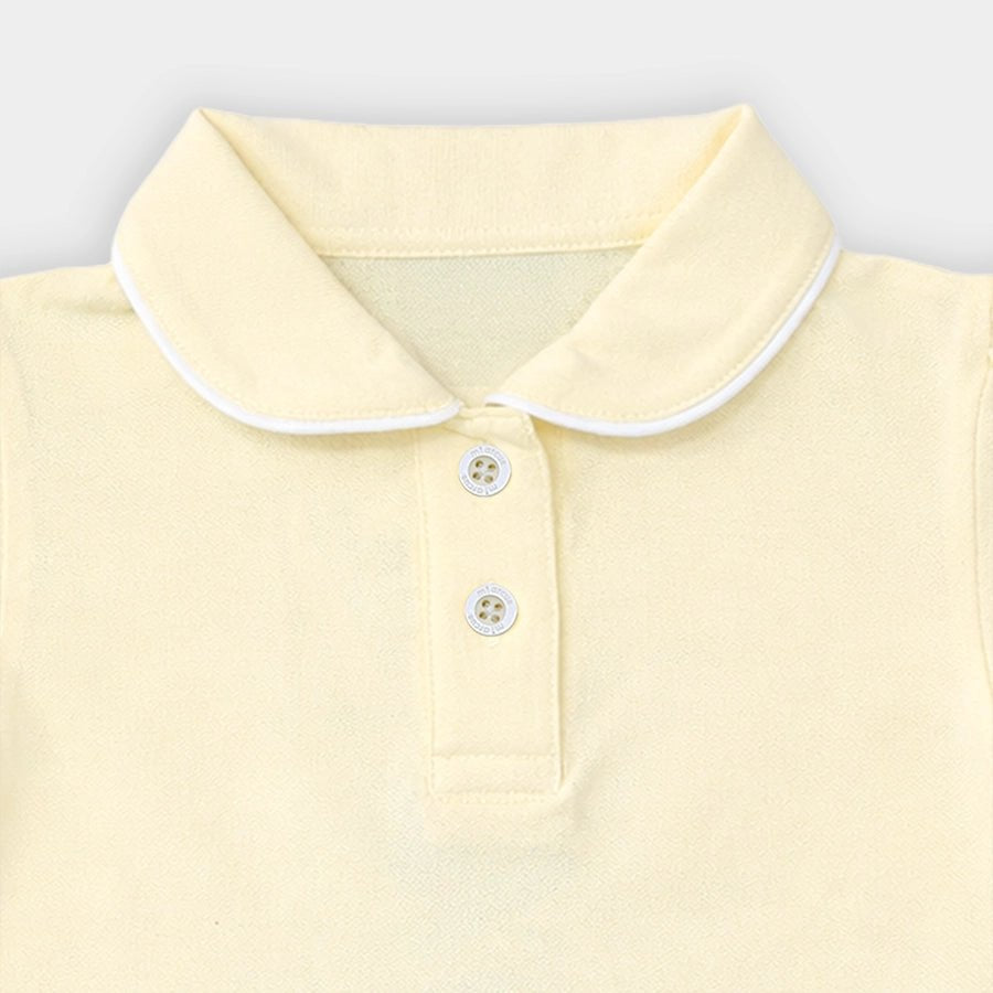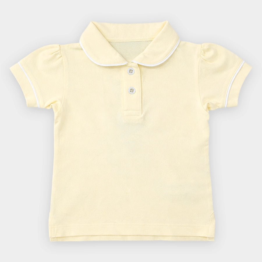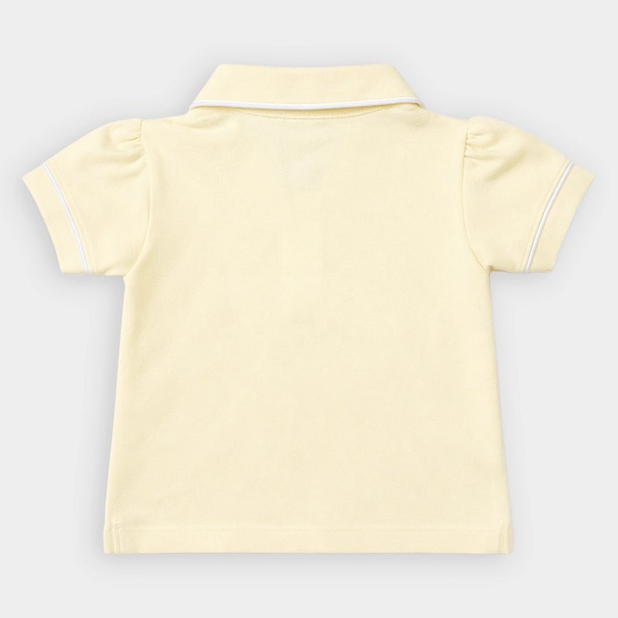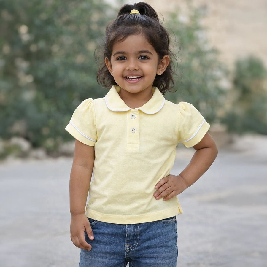 Polo t-shirt for girls in soft 95% cotton and 5% elastane blend for the summer season. Features a collared neckline, half sleeves, 2-button placket, and all-over solid colour. Available in different sizes for kids 6M-6Y.