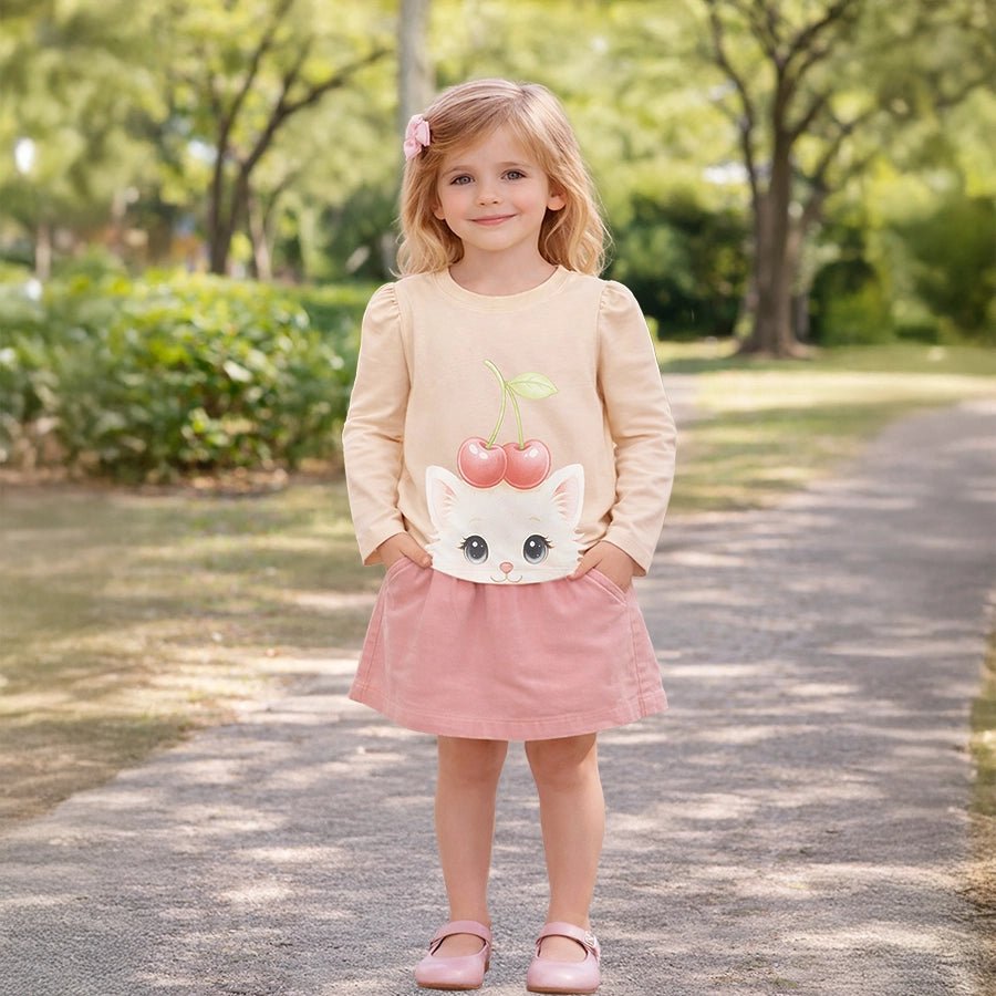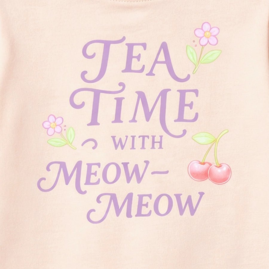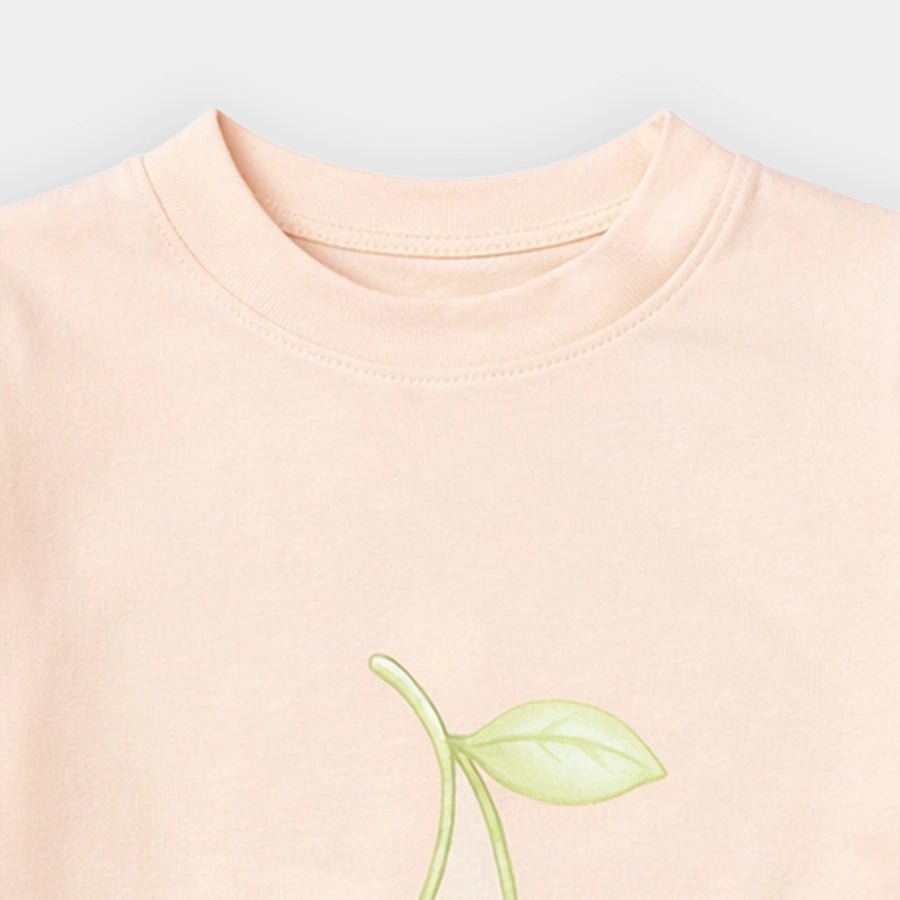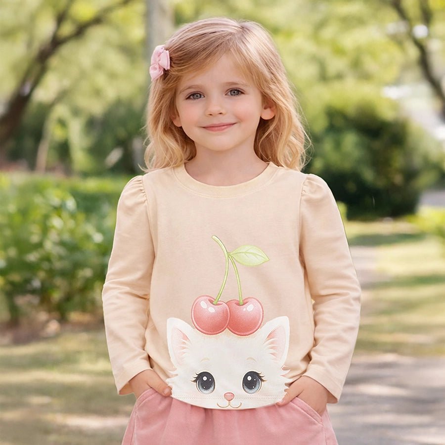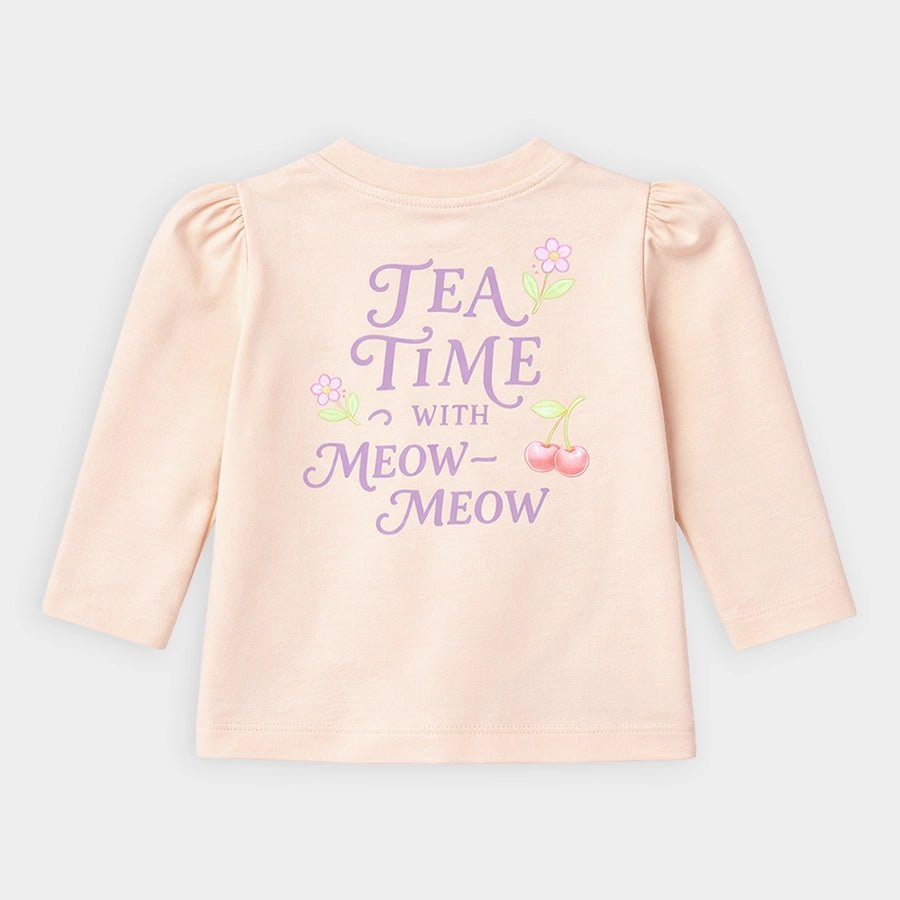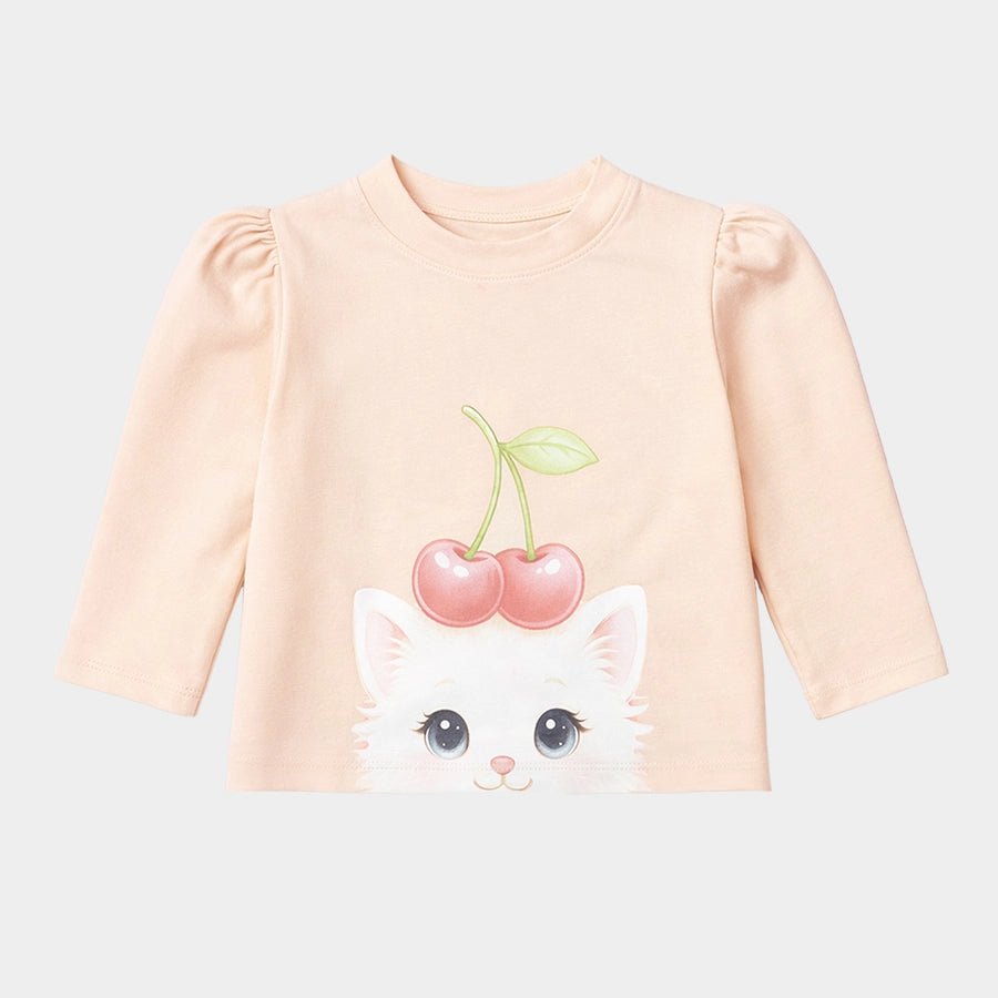T-shirt for girls in soft knit 95% cotton and 5% elastane blend for the summer season. Features full sleeves, a round neckline, and printed designs at the front and back. Available in different sizes for kids: 6M-6Y.