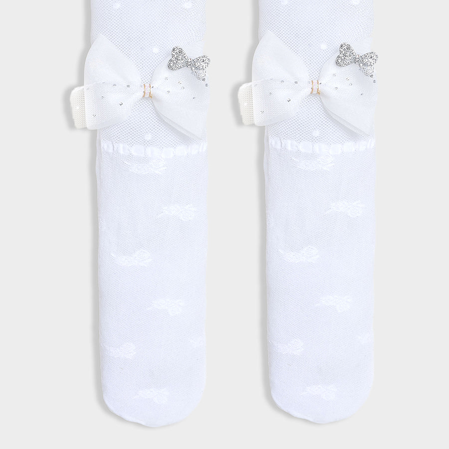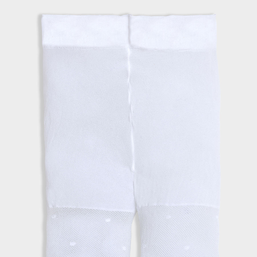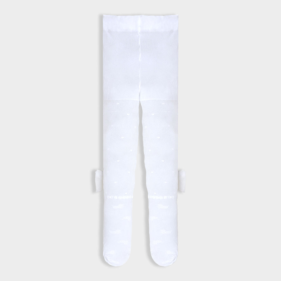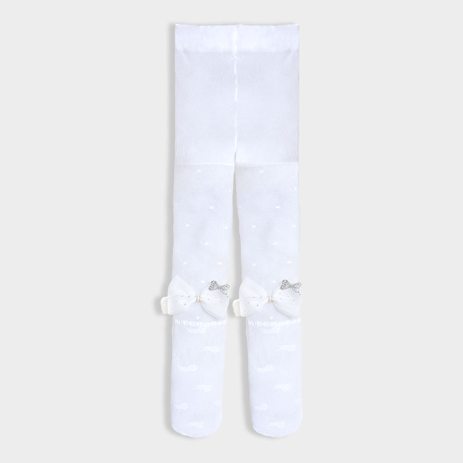 Full-length wearable stockings for girls in soft knit 90% polyamide, and 10% elastane blend for all weather. Features a polka-dot design, attached decorative bow, full-length, legging-style fit for easy wear, and elasticated waist. Available in different sizes for kids 6M-6Y.