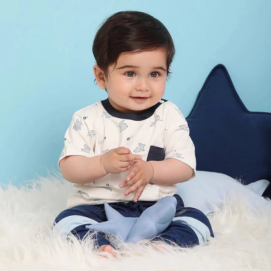 Comfy half-sleeve t-shirt in ultra-soft 100% cotton with an all-over print, ribbed neckline, and a patch chest pocket. Perfect for the summer season. Available in different sizes for kids 0-4Y.