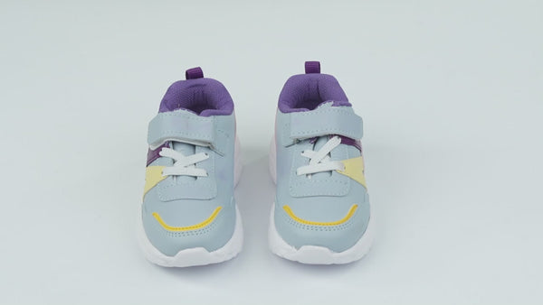 Comfortable unisex shoes in PU Leather. Features a velcro-fasten hook and loop tab, mesh material on the inside, a loop at the back for easy put-on and removal, multicoloured patterns, elastic no-tie laces on top, and patterned Peva outsole. Available in different sizes for kids 2-6Y.