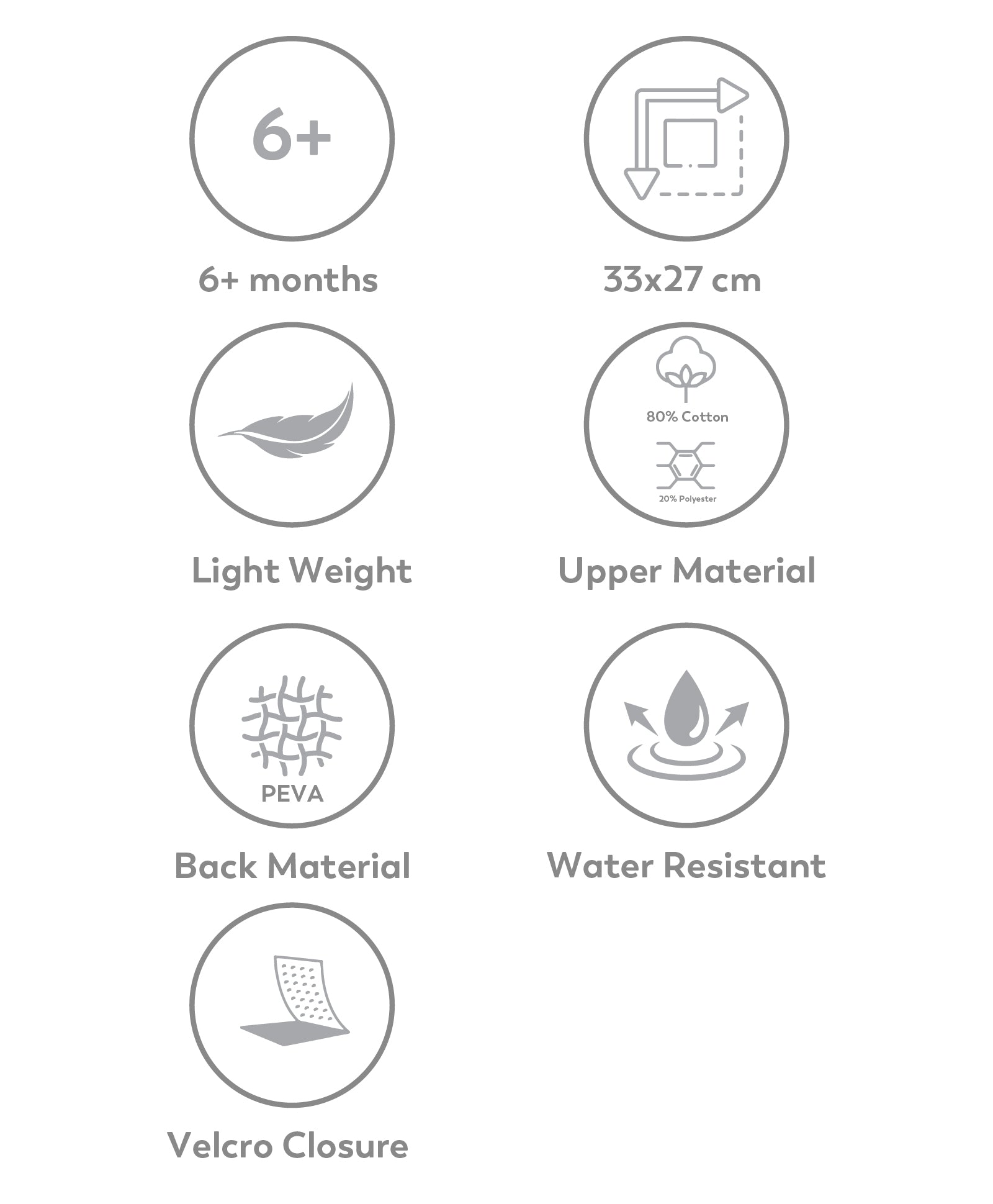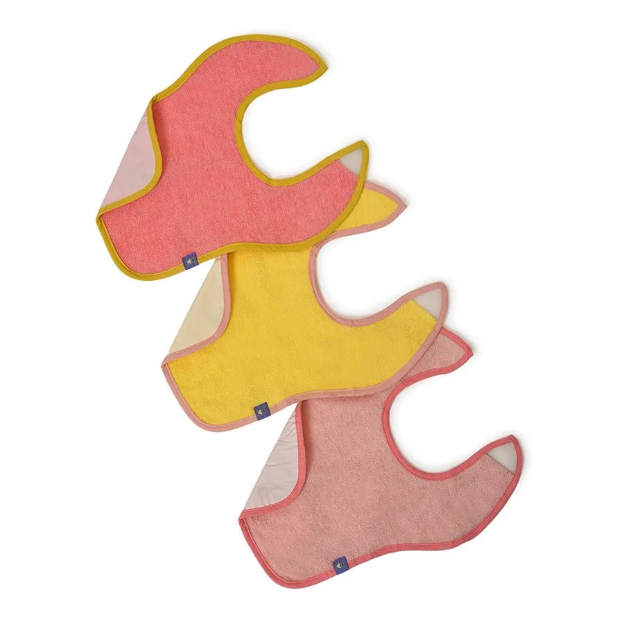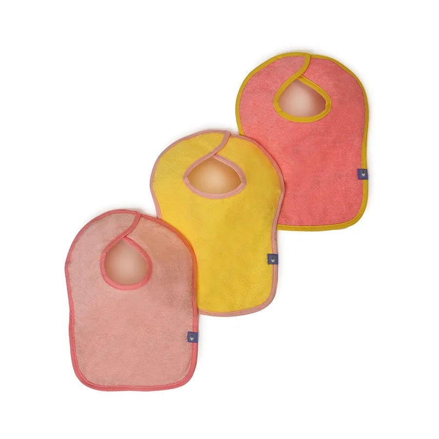 Solid-coloured weaning bibs knitted in ultra-soft 80% cotton, 20% polyester blend with a wide coverage area at the front; and water-repellant Peva fabric, easy velcro closure at the back. Best suitable for kids 6 months and above. Pack of 3.