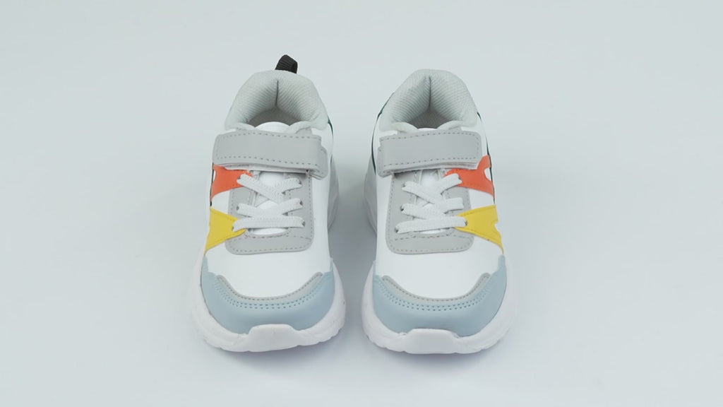 Unisex, comfortable shoes in PU leather with mesh on the inside. Features a velcro fasten hook and loop tab, elastic no-tie laces on top, and patterned Peva outsole. Available in different sizes for kids 2-6Y.